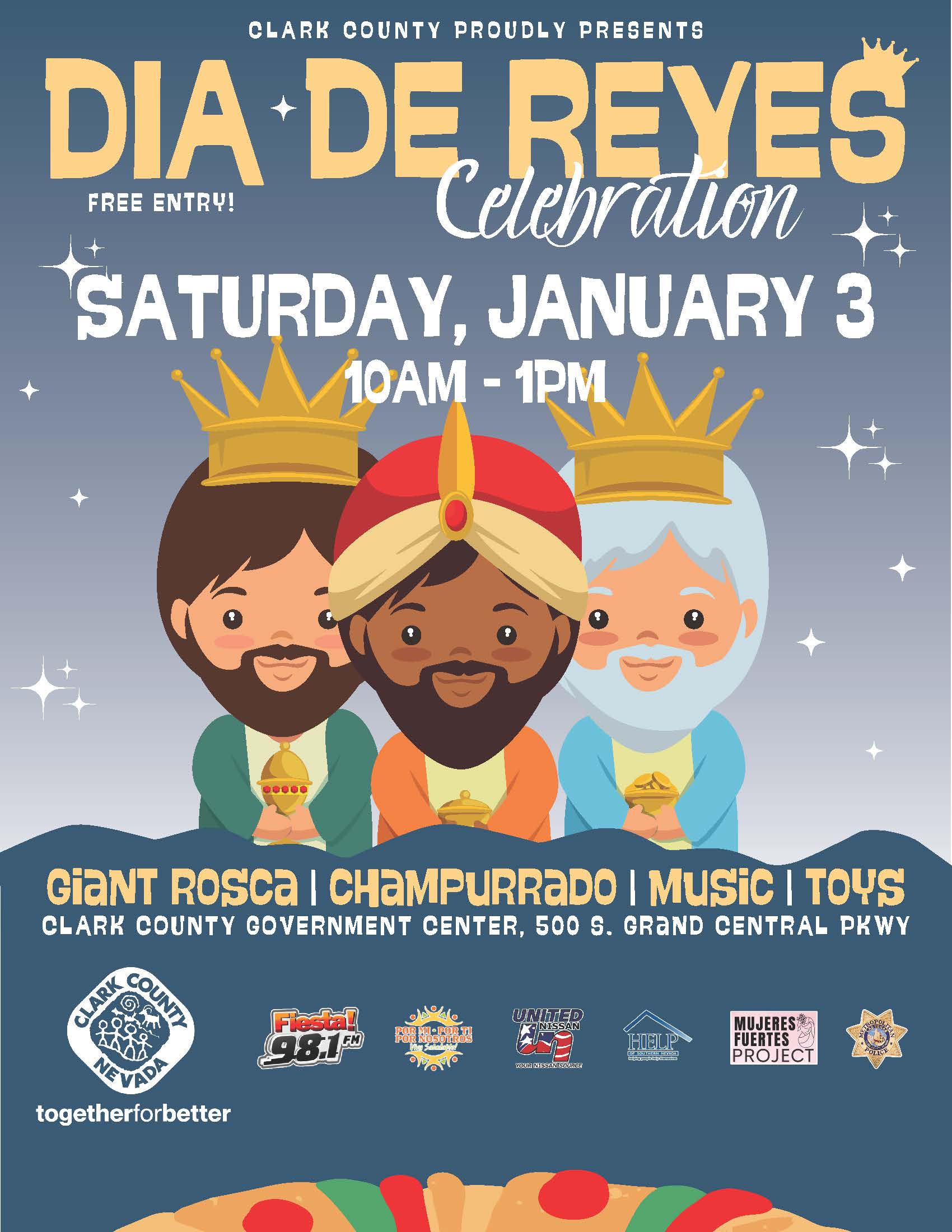 Celebración del Día de Reyes organizada por Clark County Rosca Champurrado Música Juguetes + Add to Google Calendar + iCal / Outlook export Date January 03, 2026 Expired! Time 10:00 am - 1:00 pm Location Clark County Government Center 500 S Grand Central Pkwy 6th Floor, Las Vegas, NV 89155 Share this event