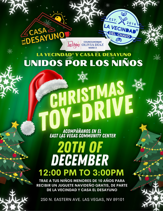 Trae a tus niños menores de 10 años para recibir un juguete navideño gratis, de parte de la vecindad y casa el desayuno.