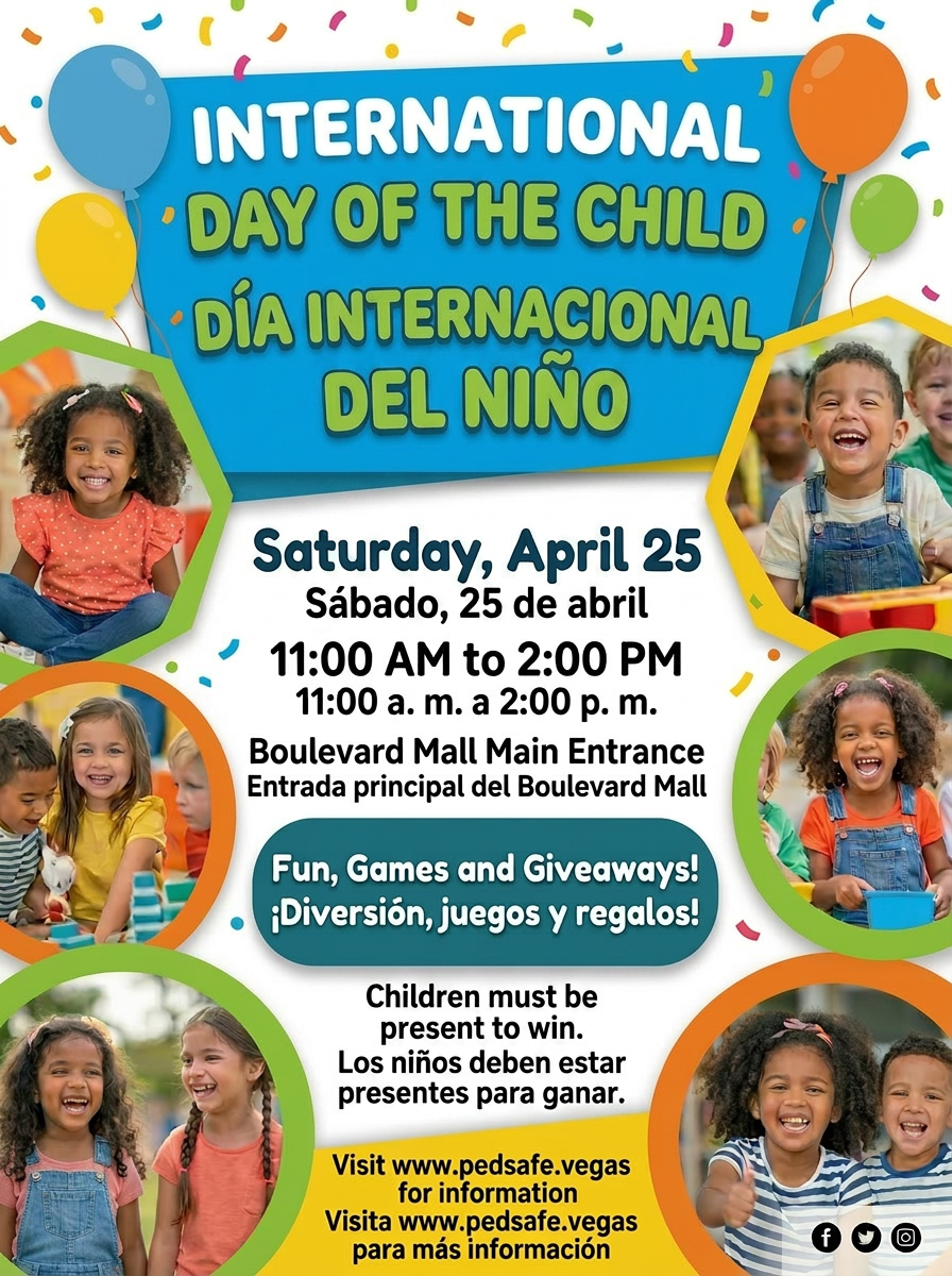 Día internacional del niño ¡Diversión, juegos y regalos! Visita www.pedsafe.vegas para más información + Add to Google Calendar + iCal / Outlook export Date April 25, 2026 Time 11:00 am - 2:00 pm Location Boulevard Mall 3528 S Maryland Pkwy, Las Vegas, NV 89169 Share this event