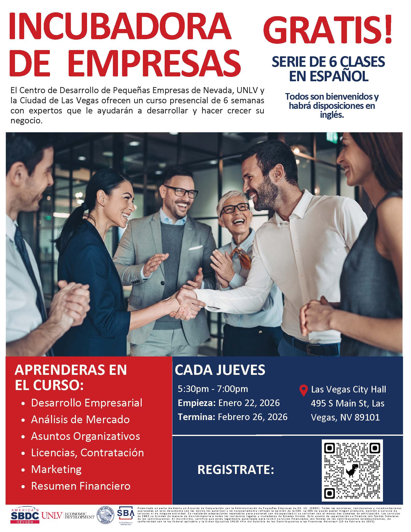 El Centro de Desarrollo de Pequeñas Empresas de Nevada, UNLV y la Ciudad de Las Vegas ofrecen un curso presencial de 6 semanas con expertos que le ayudarán a desarrollar y hacer crecer su negocio.