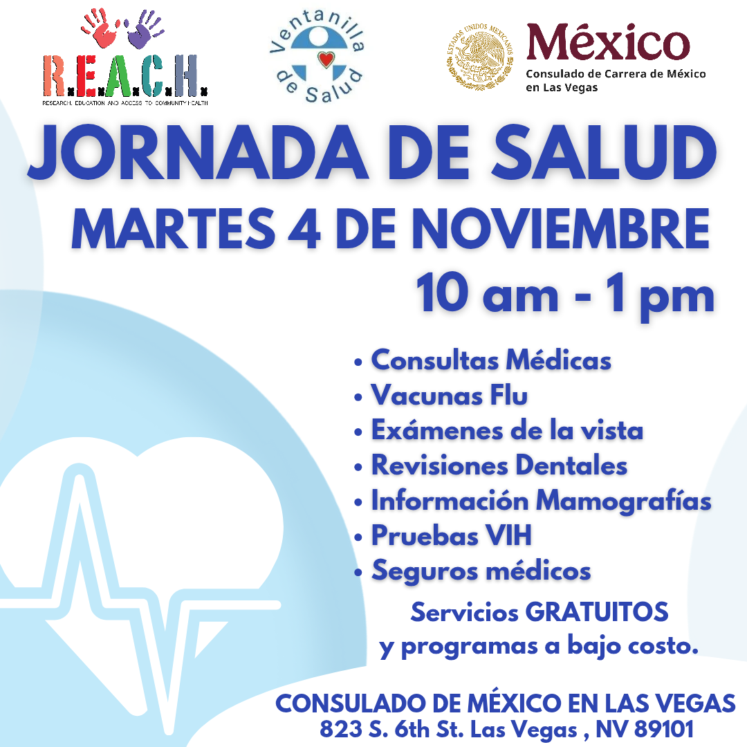 Jornada de Salud en el Consulado De México Consultas Médicas Vacunas Exámenes de la vista Revisiones Dentales Pruebas VIH + Add to Google Calendar + iCal / Outlook export Date November 04, 2025 Time 10:00 am - 1:00 pm Location Consulado de México 823 S. 6th St. Las Vegas, NV 89101 Share this event