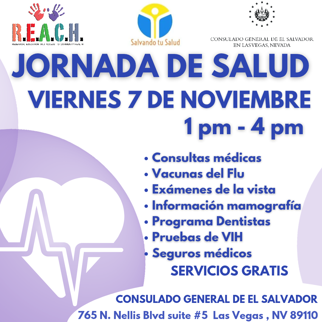 Jornada de Salud en el Consulado General de El Salvador Consultas Médicas Vacunas del Flu Exámenes de la vista Revisiones Dentales Pruebas VIH + Add to Google Calendar + iCal / Outlook export Date November 07, 2025 Time 1:00 pm - 4:00 pm Location Consulado General de El Salvador 765 N. Nellis Blvd, Suite 5, Las Vegas, NV 89110 Share this event