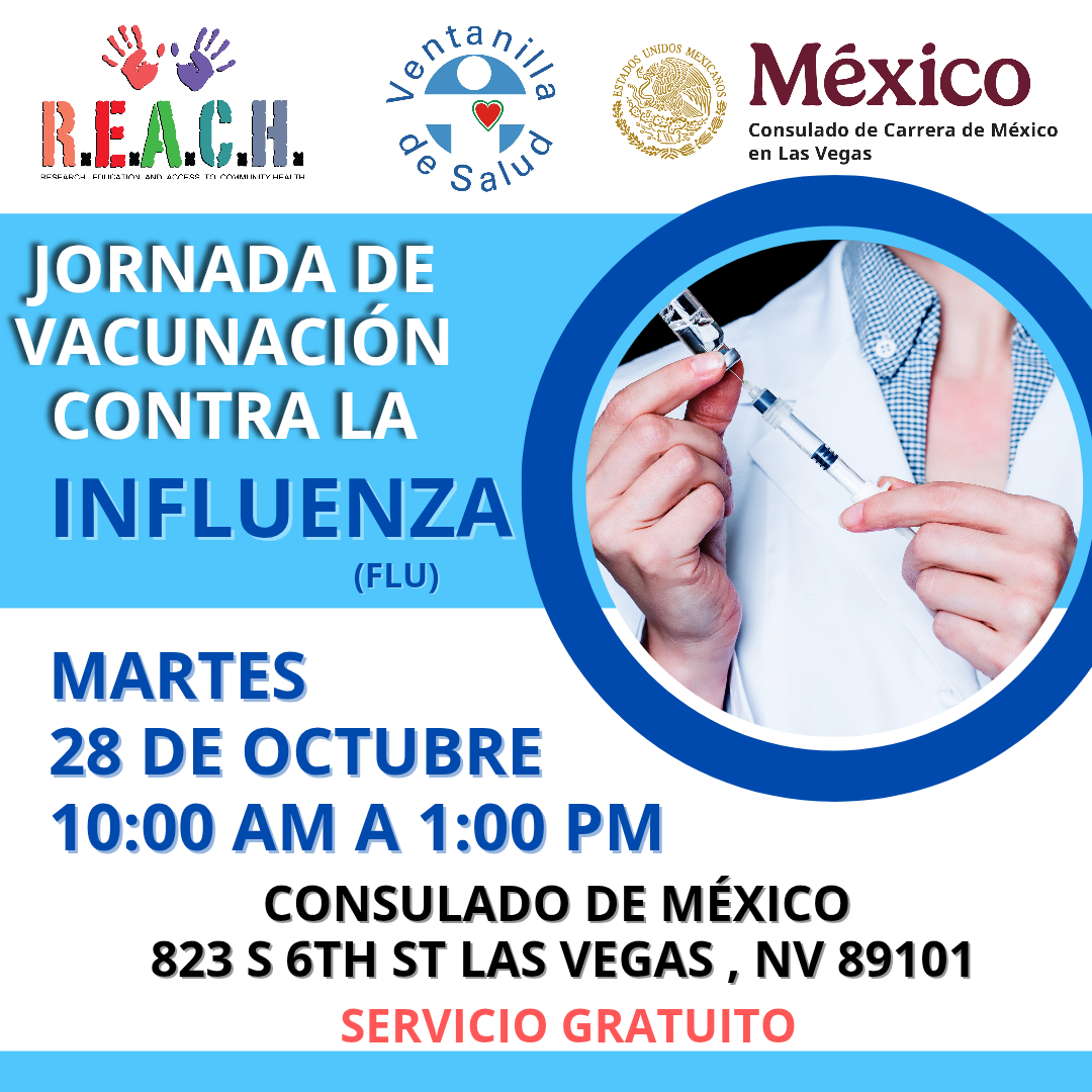 Jornada de vacunación contra la Influenza + Add to Google Calendar + iCal / Outlook export Date October 28, 2025 Time 10:00 am - 1:00 pm Location Consulado de México 823 S. 6th St. Las Vegas, NV 89101 Share this event