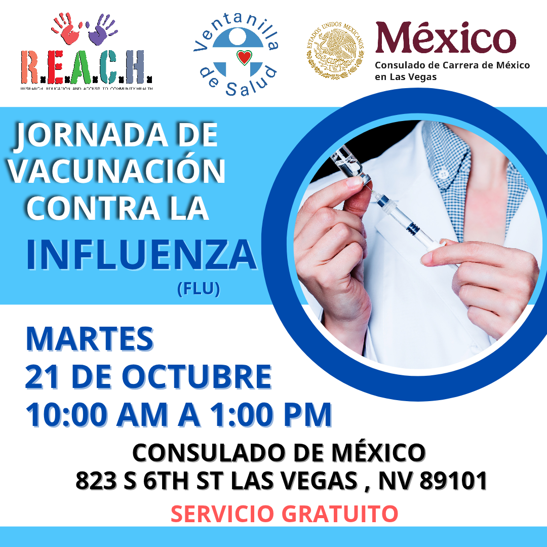 Jornada de vacunación contra la influenza + Add to Google Calendar + iCal / Outlook export Date October 21, 2025 Time 10:00 am - 1:00 pm Location Consulado de México 823 S. 6th St. Las Vegas, NV 89101 Share this event